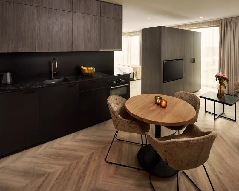 The brand new studio room is ideal for families and guests staying at the hotel for a longer period of time. This spacious room of 47m2 has a separate living room with sofa bed & smart TV and a built-in kitchen with induction hob, fridge, combination microwave oven and a sink.