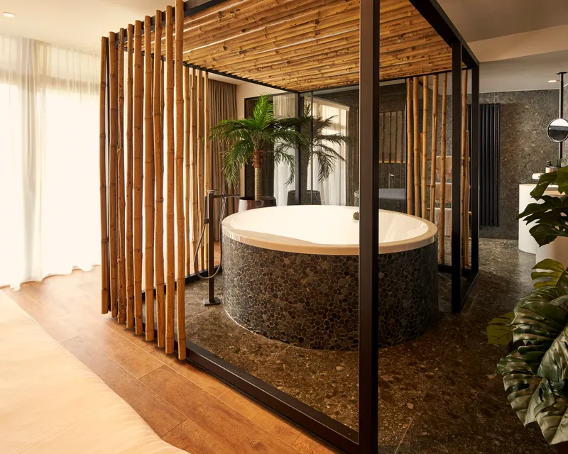 Modern suite equipped with the most desirable facilities, here you will find yourself in a tropical atmosphere with all the luxury. Flat-screen television with remote control, a bluetooth audio set, air conditioning, small fridge, sitting area, large desk, telephone, free wireless internet and safe.Open bathroom with double whirlpool bath, a luxury shower for two, hairdryer, make-up mirror, bathrobe and slippers. Our Lagoon suite is ideal for your next romantic night!