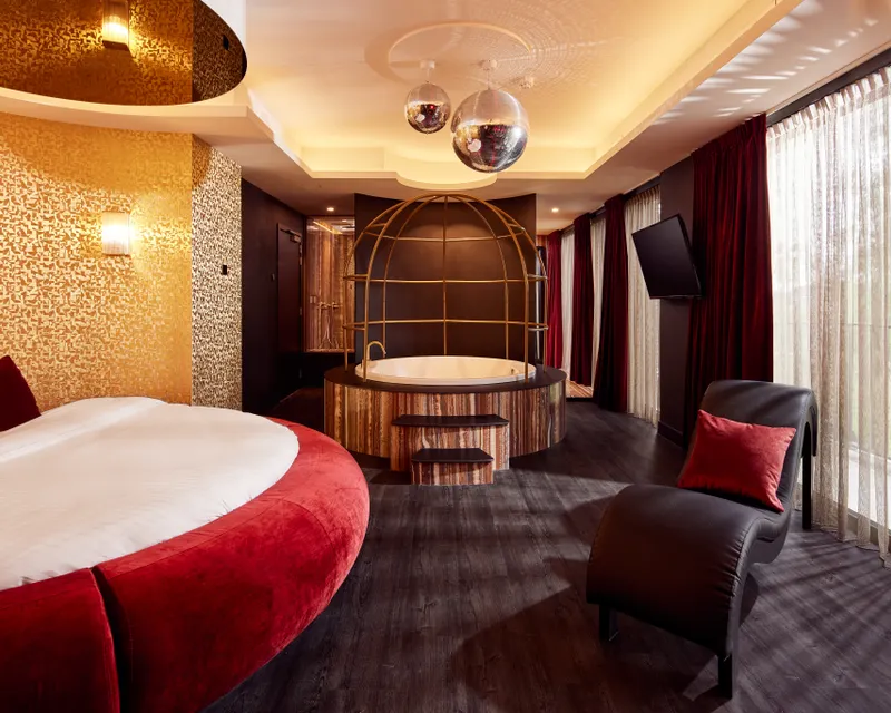 To get you completely in the mood, our suite was finished with red velvet fabrics, color LED strips and giant disco ball. The ultimate suite for you and your loved one!