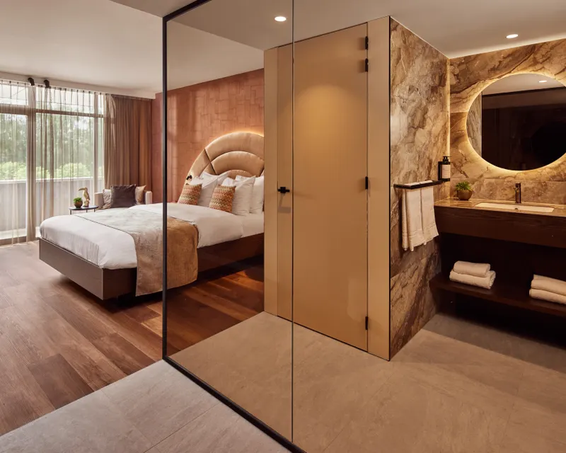 La toute nouvelle chambre deluxe a été conçue pour vous offrir le plus grand confort pendant votre séjour. La chambre spacieuse dispose d'un lit Kingsize, d'un grand bureau avec réfrigérateur, d'un balcon et d'une luxueuse salle de bain ouverte avec douche à l'italienne. Le téléviseur intelligent de 43 pouces est équipé de Casting.