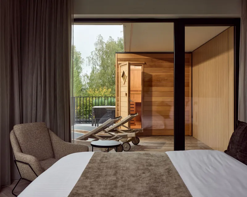 La toute nouvelle chambre exécutive a été aménagée pour vous offrir un confort optimal pendant votre séjour. Cette chambre spacieuse est équipée d'un lit king size, d'un grand bureau avec réfrigérateur, d'un balcon et d'une luxueuse salle de bains ouverte avec douche à l'italienne. La télévision connectée de 43 pouces est équipée de la fonction Casting. Cette chambre exécutive se distingue par son agréable sauna privé sur la terrasse.