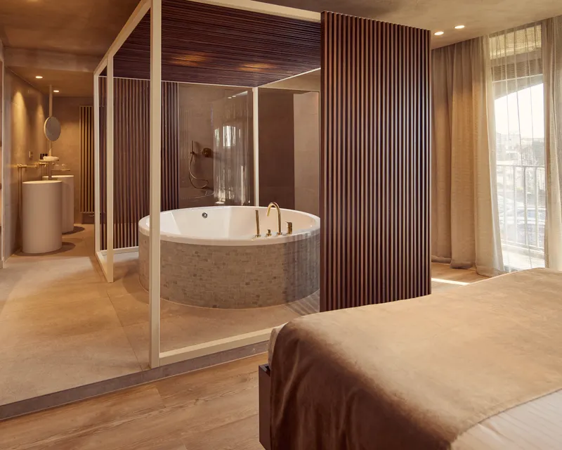 La salle de bains ouverte est une oasis de détente avec un bain à remous double et une douche luxueuse pour deux personnes. Pour plus de commodité, un sèche-cheveux, un miroir de maquillage, un peignoir et des pantoufles sont également fournis. En bref, notre Nomad Suite est le choix idéal pour votre prochaine nuitée romantique!